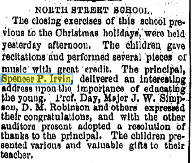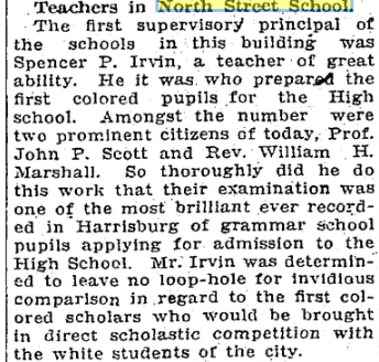 About Me: “The first supervisory principal of the schools in this building was Spencer P. Irvin, a teacher of great ability. He it was who prepared the first colored pupils for the High school. Amongst the number were two prominent citizens of today, Prof. John P. Scott and Rev. William H. Marshall. So thoroughly did he do this work that their examination was one of the most brilliant ever recorded in Harrisburg of grammar schools pupils applying for admission to the High School. Mr. Irvin was determined to leave no loop-hole for invidious comparison in regard to the first colored scholars who would be brought in direct scholastic competition with the white students of the city.” — Harrisburg Patriot, 1913, J. Howard Wert.