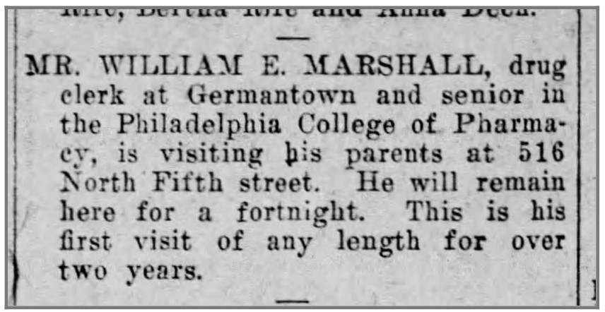 Connections: Dr. A. Leslie Marshall (brother and neighbor on Boas Street), Alexander Dennee Bibb (cousin), William H. Marshall (father), Harriet (McClintock) Marshall (grandmother), Josephine Dennee Bibb Davidson (aunt), Morris H. Layton, Jr. (cousin), Morris H. Layton, Sr. (uncle), Morris J. Layton, Jr. (cousin).