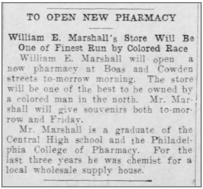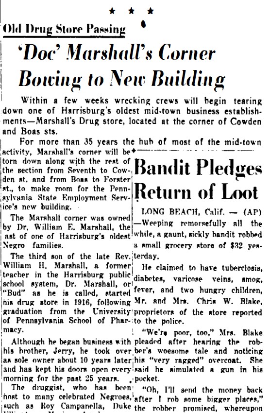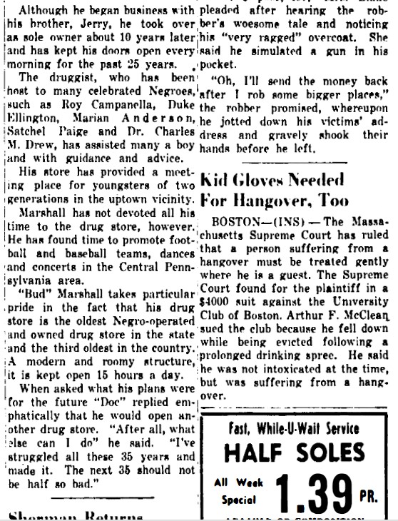 “The druggist, who has been host to many celebrated Negroes…has assisted many a boy with guidance and advice.” Patriot, March 11, 1951.