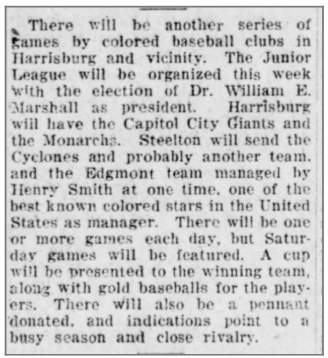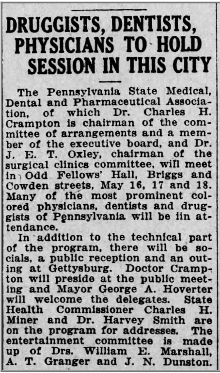 Activism: Pennsylvania Medical, Dental, and Pharmaceutical Association; Junior League of Harrisburg Colored Baseball (president); Owner of Harrisburg Governors Football; Harrisburg Homes Company (board); Forster Street YMCA; Harrisburg Scholastics (organizer/manager).