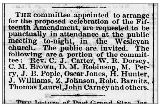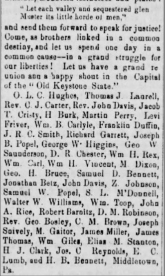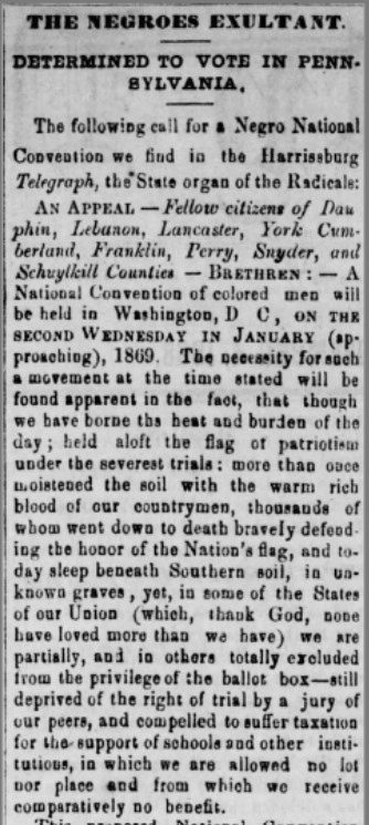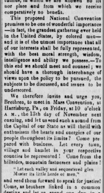 My Contribution: I was a prominent local minister, music teacher, and property owner in the Eighth Ward who was very active in ensuring political rights in my community. I worked diligently for the equality of Black citizens after the Civil War both on a local level as the president of the Equal Rights Club of Dauphin County, and as a participant in national conventions. I led programs to commemorate the passing of the Fifteenth Amendment and marched as marshal in a parade celebrating U.S. Colored Troops buried in Harrisburg.